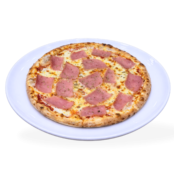 Molho de tomate, queijo mozzarella, fiambre e cogumelos.
